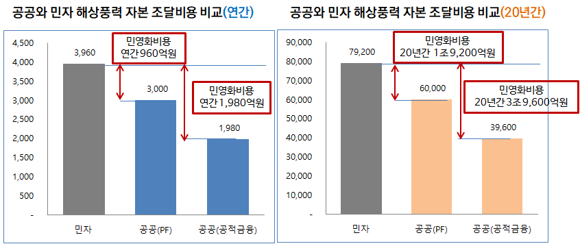 2) 그 해상풍력을 20년간 운영한다고 했을 경우에, PF 방식의 공공재생에너지 비용이 6조 원이 드는 반면 민자는 7억 9,200억 원이 소요되고, 공공재생에너지가 PF가 아닌 공적 금융 방식으로 자금을 조달하는 경우에는 민간과의 소요 비용이 두 배 차이가 나는 것으로 확인됐습니다.