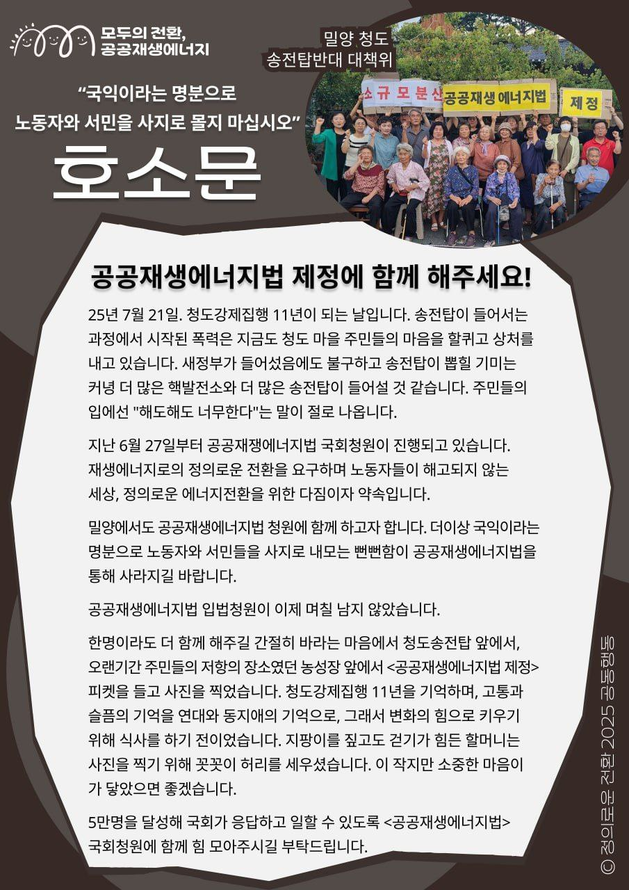 밀양 청도 송전탑반대 대책위로부터 온 공공재생에너지법 지지 메시지 - "공공재생에너지법 제정에 함께 해주세요!"