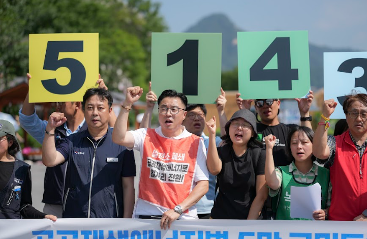 2. ‘정의로운전환 2025 공동행동’은 오늘(7월 29일, 화) 오전 10시 광화문 이순신 동상 앞에서 5만 청원 성사를 알리고, 그 의미와 향후 계획 및 결의를 밝히는 기자회견을 가졌다. 이보아 공공재생에너지연대 상황실장은 청원 성사가 결코 쉽지 않았다고 짚으면서, “6월 7월, 그 어느때보다 기후위기가 내 코앞의 일임을 보여주는 시기에 전개되며 공공재생에너지법이 왜 필요한지를 새삼 확인하고 다짐하는 시간”이었다다고 의미를 부여했다. 또한 이번에 청원인으로 나선 이태성 발전비정규직연대 집행위원장은 “이제 공공재생에너지 첫단추를 끼고 새로운 희망을 품으며 발전노동자는 기후위기를 심화시키는 노동을 거부”하고 “정의로운 에너지 전환 맨 앞에서 발전노동자가 싸우겠”다고 결의를 밝혔다.
